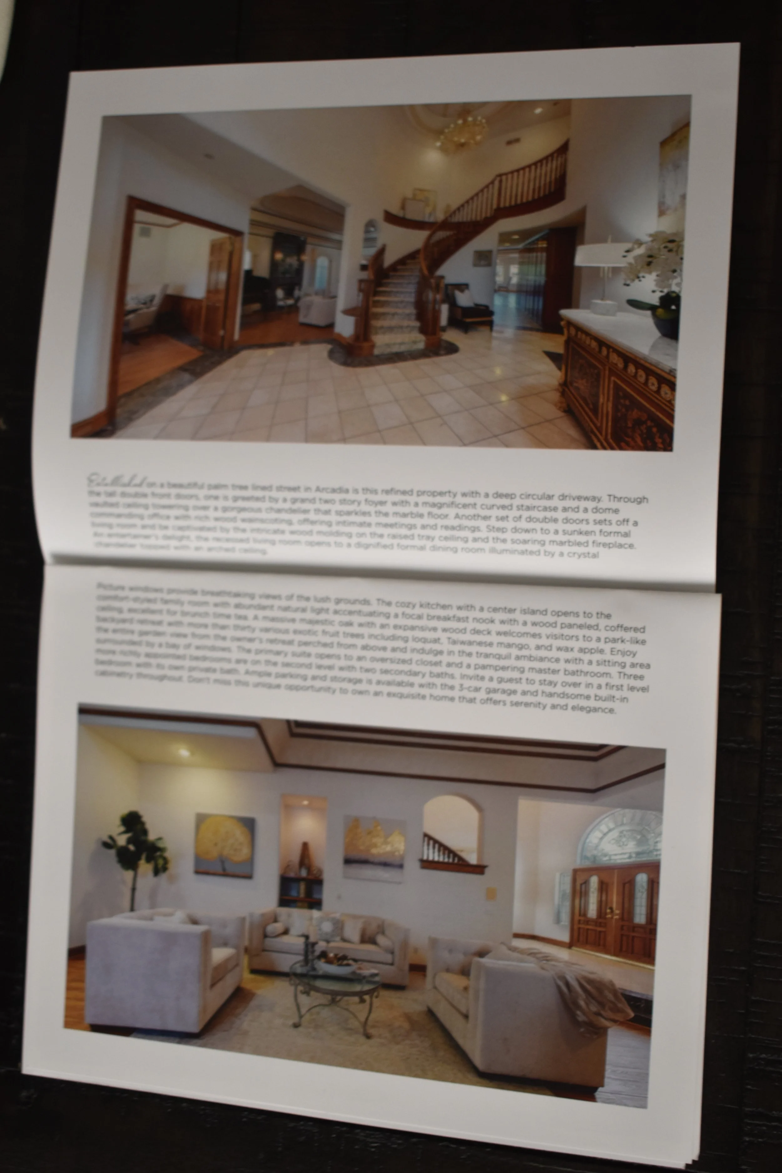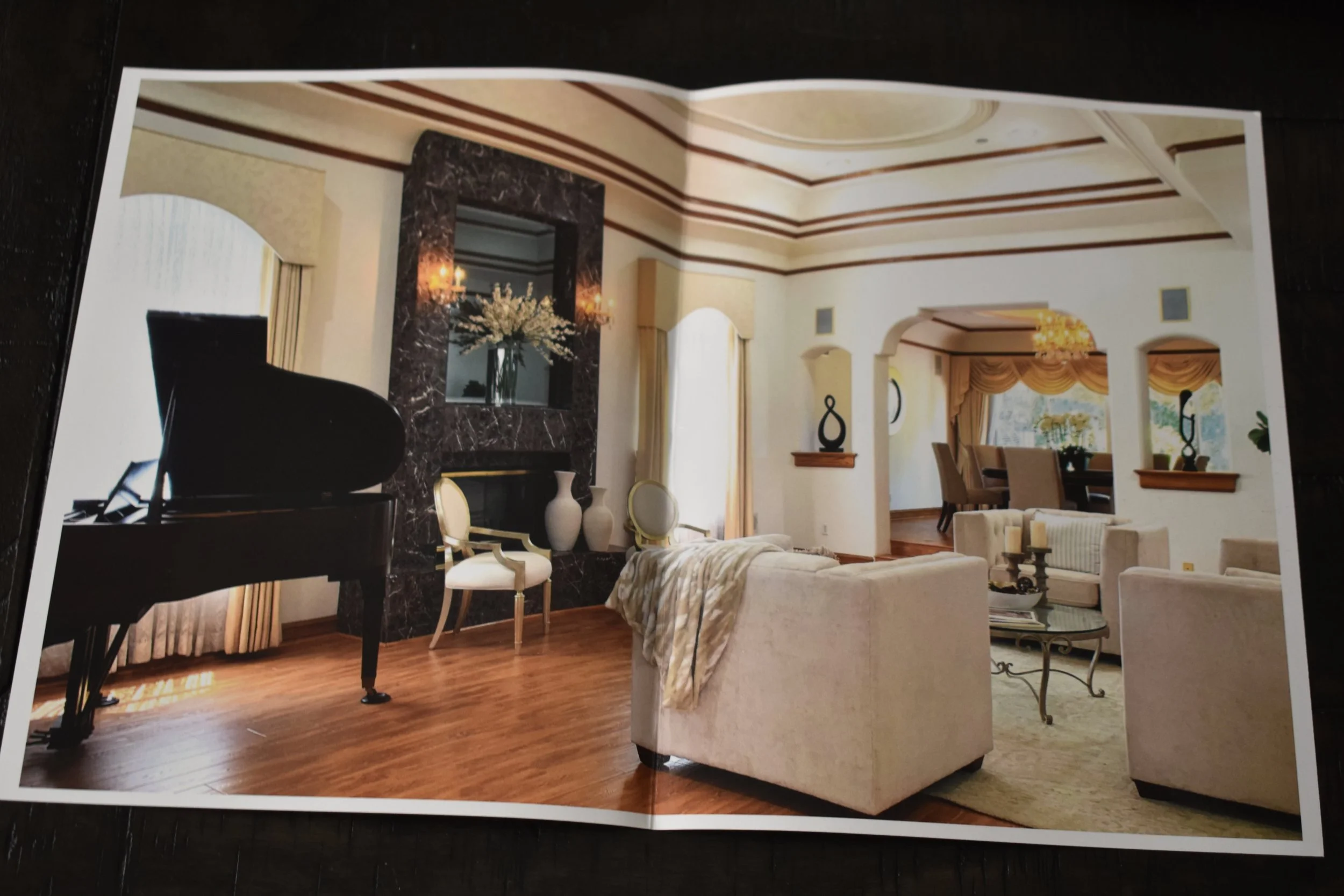 17” x 11”; I worked with both matte and glossy paper on InDesign. I also used Adobe Photoshop to brighten photos and bring out the color in property images.